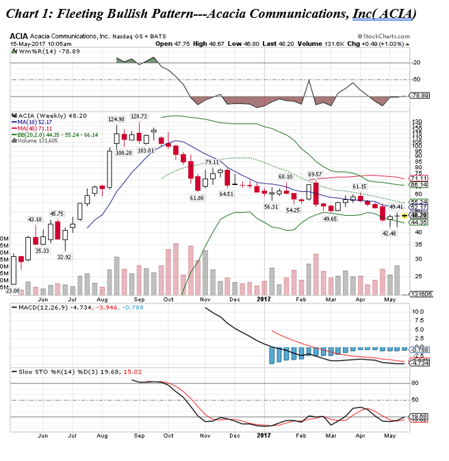 This pattern occurs when IPO stock prices keep rising after the first trading day without digesting the IPO gains, but then subsequently flops. Acacia Communications Inc. (ACIA)shows a fleeting bullish pattern (See Chart 1). ACIA rose to $128.73 on September 6, 2016 from its IPO price of $23.00 on May 13, 2016, but has fallen to its currently, recently closing at $48.67. During that four-month upsurge, ACIA advanced more than 450% in a short period of time.
